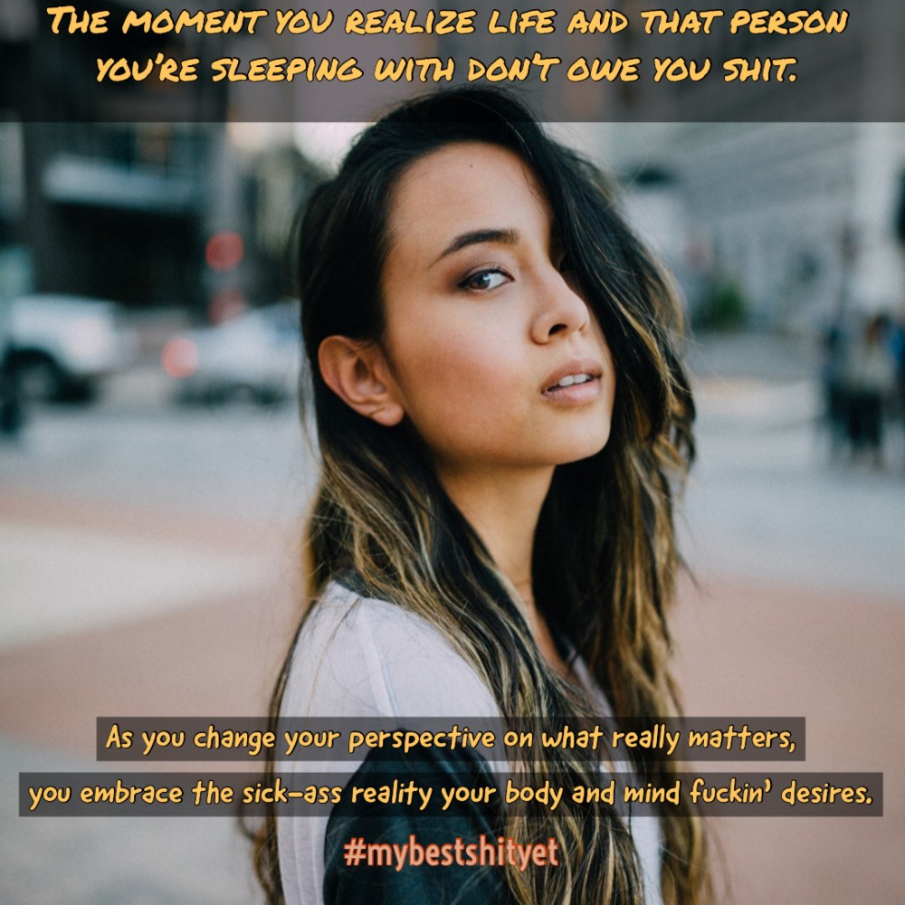 So start by refocusing your priorities on the best shit that matters and place a higher fuck on your own abilities to make your dream work. But first you must get off your knees, clean your face, and put on a fresh change of clothes. You just can’t lay around naked waiting for God to blow your fucking three some fantasies asunder as that gaping hole under your bedroom swallows you whole.